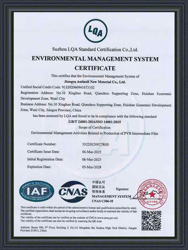 I ré ina bhfuil inbhuanaitheacht mar thosaíocht dhomhanda, tá ATL tiomanta do dhéantúsaíocht atá freagrach don chomhshaol. Leanann an chuideachta polasaithe dochta cosanta comhshaoil, úsáideann sí teicneolaíochtaí táirgthe atá neamhdhíobhálach don chomhshaol, agus cinntíonn sé go gcomhlíonann gach scannán PVB ailtireachta PVB le caighdeáin ábhartha sábháilteachta agus comhshaoil, lena n-áirítear deimhniúcháin EN, ASTM, agus ISO.